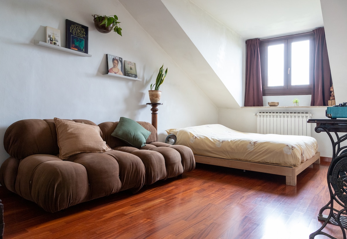 Our home, nestled among the trees, rests in peaceful seclusion a couple of kilometers from the nearest village. We are Riccardo, Cristina, Lorenzo, Bianca and Alice. We chose to come here, into the woods, to begin living a simple yet fulfilling life, learning from nature. We offer you an attic loft carefully renovated by Riccardo, with a double bed and a sofa bed (both beneath skylights), a kitchenette, a bathroom, and a wide view over the valley.