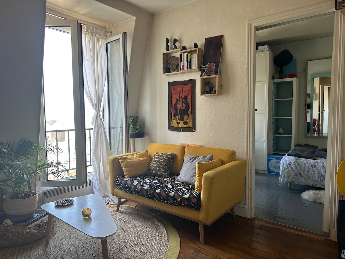 Luminous flat on 5th floor with elevator, nice view (you can see the Eiffel Tower from the balcony), very pleasant area (2 minutes from Place des Abbesses), very well desserved (Métro Pigalle 1 minute).