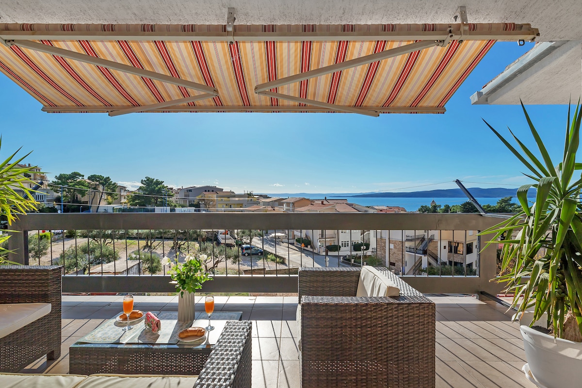 Das Penthouse ist i der 3. Etage und hat einen sensationellen Blick auf das Meer, die Stadt, die Inseln Brač und Haar. Den Sonnenuntergang lässt sich von der großzügigen Terrasse wunderbar genießen. Das Haus liegt in einer Sackgasse und auch verkehrsruhig mit dazugehörigen Parkplätzen und viel Grün. Der Infinitypool mit auch einem Blick auf das Meer bietet für alle Gäste im Haus einen Badespaß. Die Wohnung ist mit allen nötigen Dingen ausgestattet.