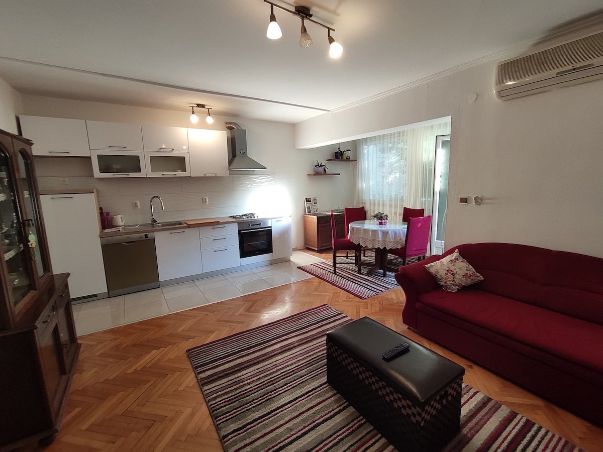 The modernly furnished apartment has a room with a separate air conditioning, TV and modern lighting. The kitchen is equipped with dishwasher, ceramic plate, microwave and all the equipment. The living room has sofas for a third person and its tv and air conditioning. The apartment has a beautiful terrace overlooking the sea, ancient Salon and Split. Guests can use our swimming pool and barbecue in the garden.