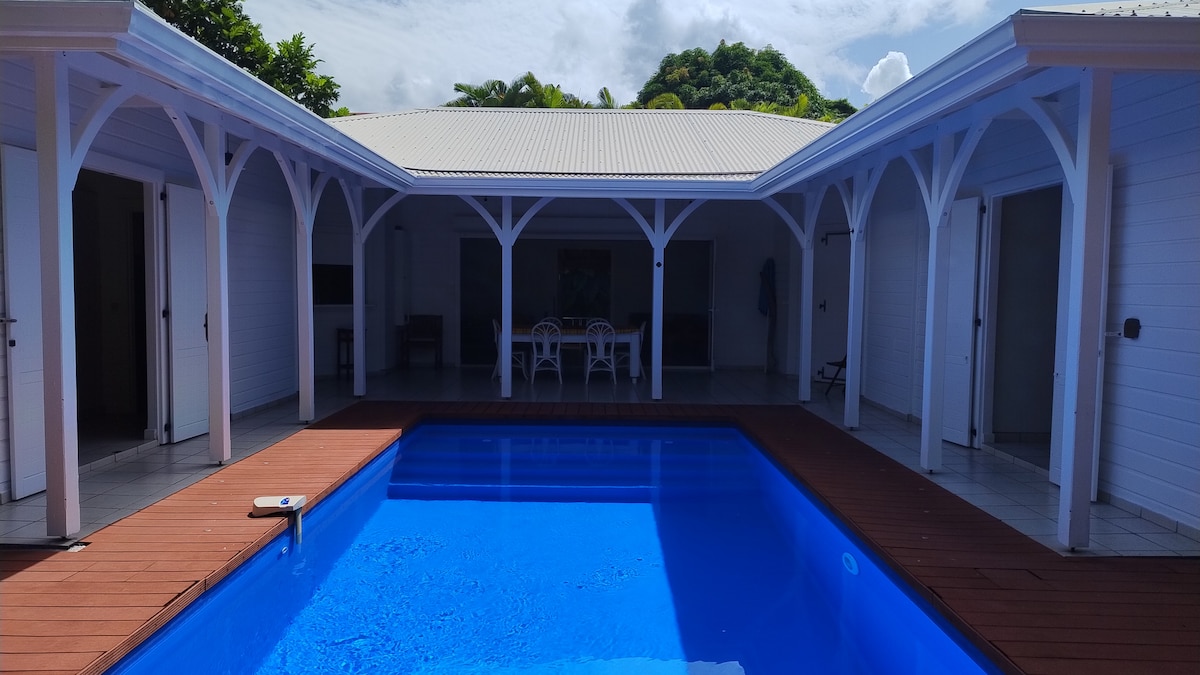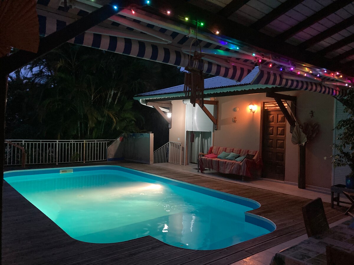 Chez l'habitant bas de villa. conçu pour 2 adultes+2 enfants. Cuisine extérieure. Tv, clim, brasseur d'air, wifi, linge de maison, vaisselle, barbecue. Piscine 10mx5m au sel. Lit 140x190 mezzanine 2 adultes en bas 2 enfants au dessus + lit bébé à la demande.5' de la ville et plage 10' de la Soufrière. Parking assurée. 15' des traces et des rivières et cascades. En famille, ou avec des amis, possibilité de réserver dans le même lieu un bungalow en bois type créole https://abnb.me/75b4kVWNqtb