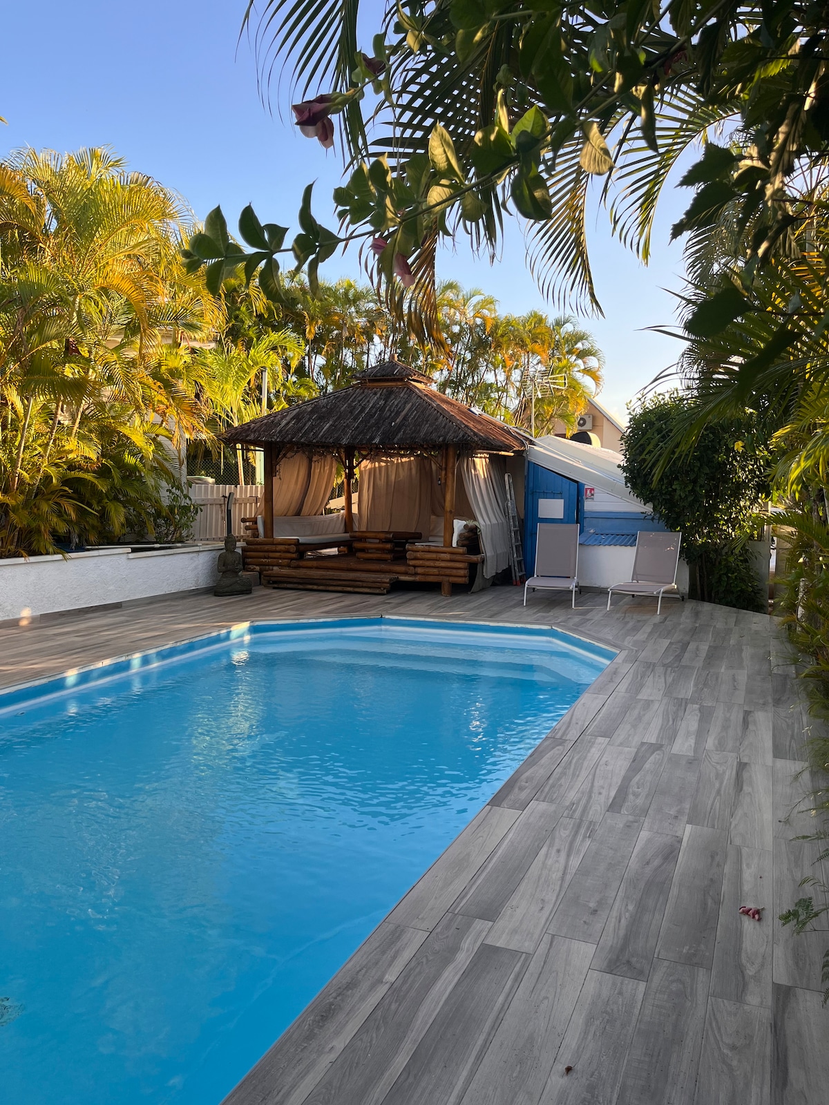 Dans quartier résidentiel très calme le WAYAKOYA, petit bungalow aux couleurs locales de 40m2 pour 2 adultes + 2 couchages en mezzanine ( surtout pour enfants)+ lit et chaise bébé 1 chambre climatisée lit de 160 1 salle d'eau+ wc 1 cuisine+ salon en terrasse 1 piscine privée 1 entrée privative wifi lave-linge & vaisselle four, micro onde frigo congélateur draps linge toilette & plage fournis Port commerces plage à 5 mn A l'arrivée apéritif de bienvenue offert