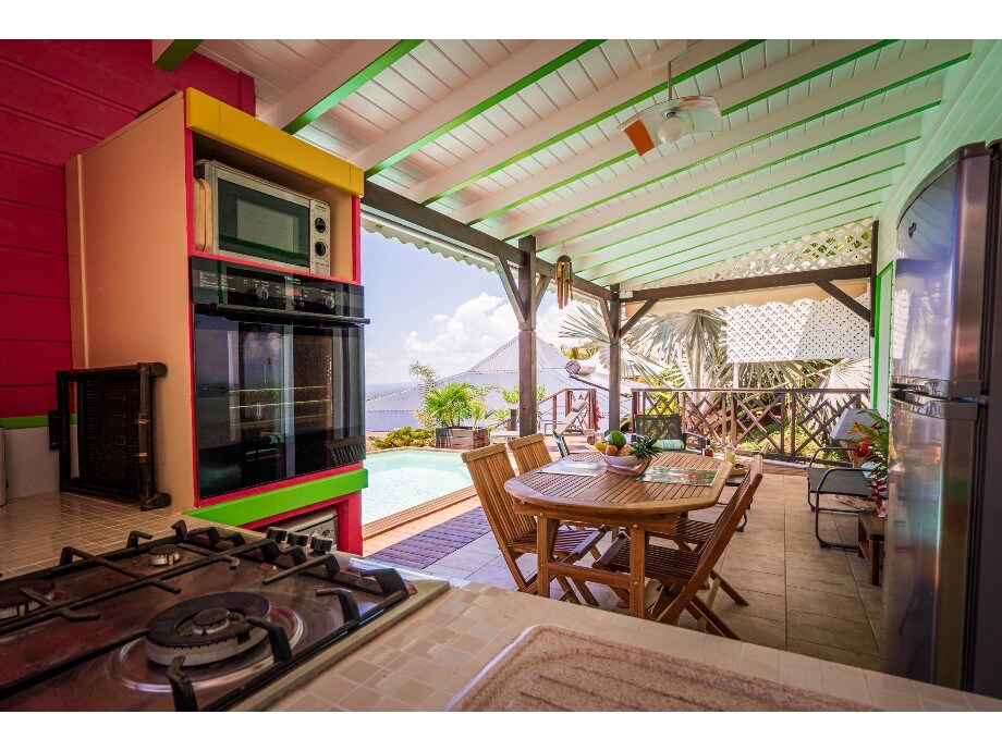 Bungalow en bois avec vue sur mer, niché dans un écrin de verdure, entre forêt tropicale et mer des caraïbes. Situé à quelques minutes de 3 magnifiques plages, il est composé d’un jardin privé, parking, d’une terrasse, d’un salon cuisine (avec TV et wifi) et a l’étage, d’une chambre parentale climatisée, (lit 160), avec salle de bain . A votre arrivée, vous pourrez déguster votre planteur de bienvenu face à la mer, avant de partir visiter notre incroyable île... A bientôt au paradis...