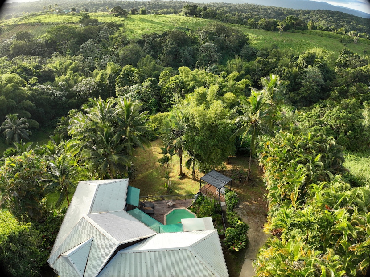 Ravin-Là fait partie du site "Acomat-Bellevue" sur les hauteurs d'Acomat. Ce grand bungalow créole en bois rouge, niché au calme dans un écrin de verdure avec une vue sur la forêt tropicale et une ouverture sur la mer, vous reconnectera avec la nature. Les chambres ventilées naturellement offrent un confort apprécié. La terrasse avec barbecue et l'espace piscine ( commune ) invitent au farniente. Les colibris accompagneront vos repas et c'est le chant de la forêt qui vous bercera au crépuscule.