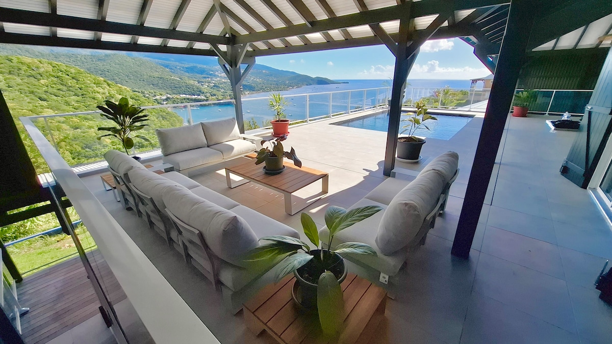 Charmant bungalow décoré avec goût situé entre mer et montagne, offrant une vue exceptionnelle sur les Saintes et Marie-Galante depuis une magnifique terrasse en bois avec jacuzzi. Vous pourrez apprécier la mer à perte de vue et profitez du confort de chacune des chambres ouvertes vers l'extérieur. Une localisation parfaite pour accéder aux chutes du carbet 10min, à la gare maritime pour les Saintes 7min, aux plages de sable noir 3min, à la Soufrière 25min.. Idéal pour les familles, amis...