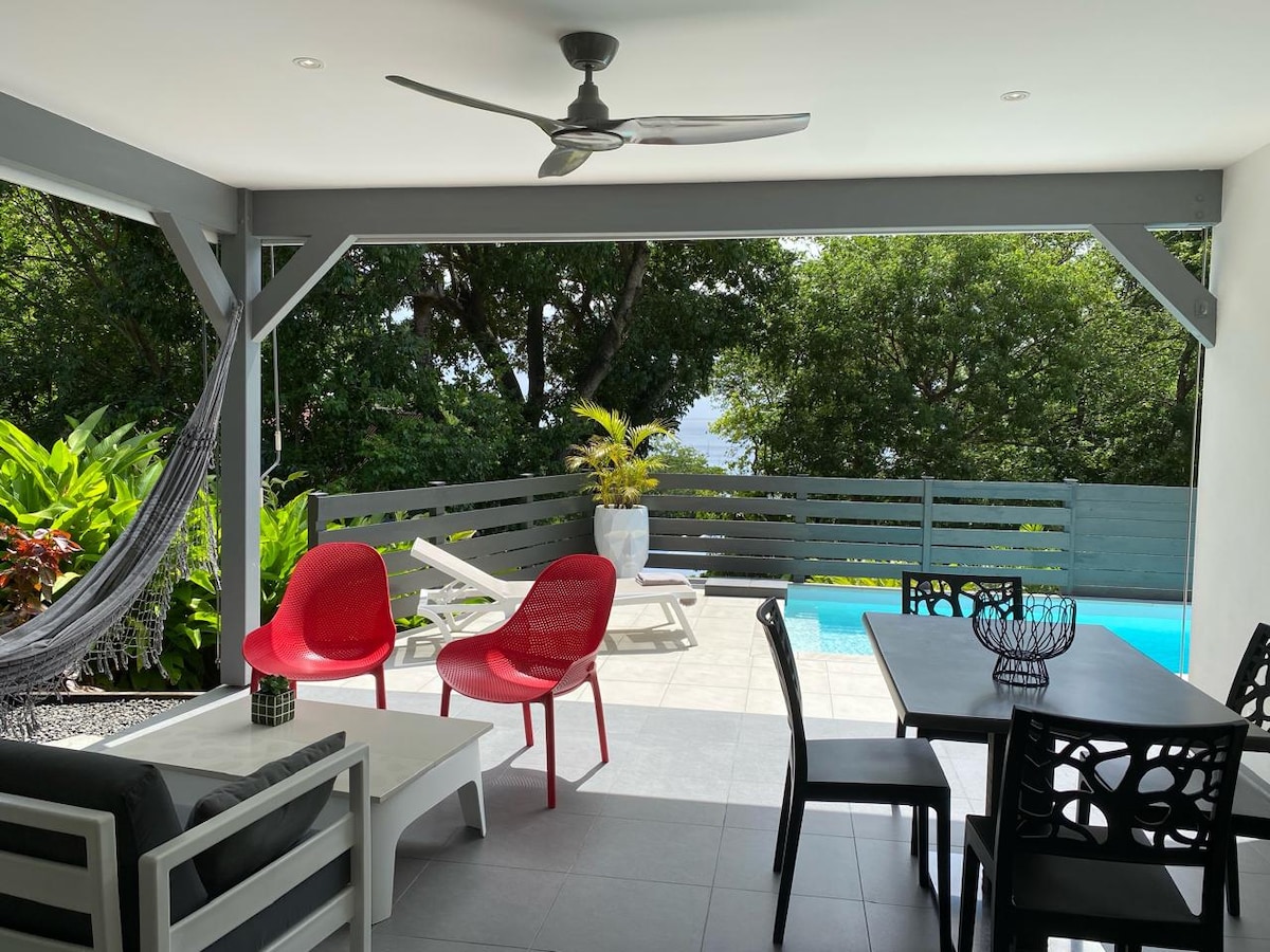 Charmante villa neuve vue panoramique sur mer des Caraïbes, piscine, entrée et parking privatifs. Première ligne dans un domaine clos avec accès direct crique, proche plages Leroux et Petite-Anse. Deux grandes chambres climatisées (2 à 4 hôtes), lits king-size, moustiquaire, dressing. Spacieuse salle de douche, toilettes et buanderie séparés. L'espace de vie comprend une terrasse-séjour avec stores électriques, brasseurs d’air, téléviseur, wifi, et cuisine ouverte entièrement équipée, plancha.