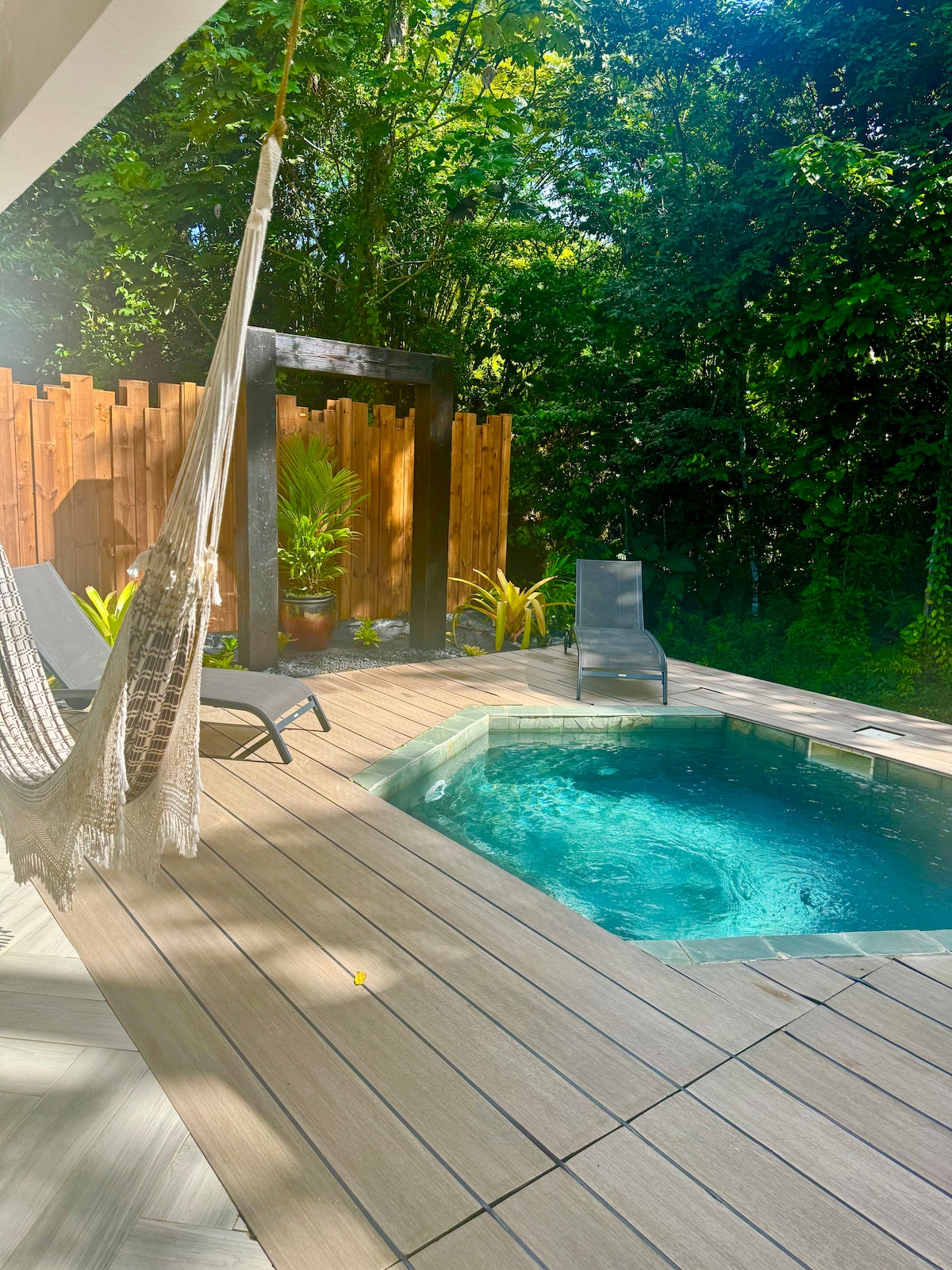 Votre séjour dans notre gîte, au rez-de-jardin du chalet, dans une nature luxuriante ne vous donnera qu'une envie de revenir. De ce lieu unique qui vous offrira tout le charme et le confort nécessaires pour passer de bonnes vacances, vous serez à 2 minutes d'un bain en rivière et à 4 minutes d'un bain en mer Caraïbes. L’expérience inoubliable de nager avec les tortues de la Réserve Coustaud puis de finir par un bain en rivière avant d'aller vous prélasser dans les hamacs qui vous attendent.