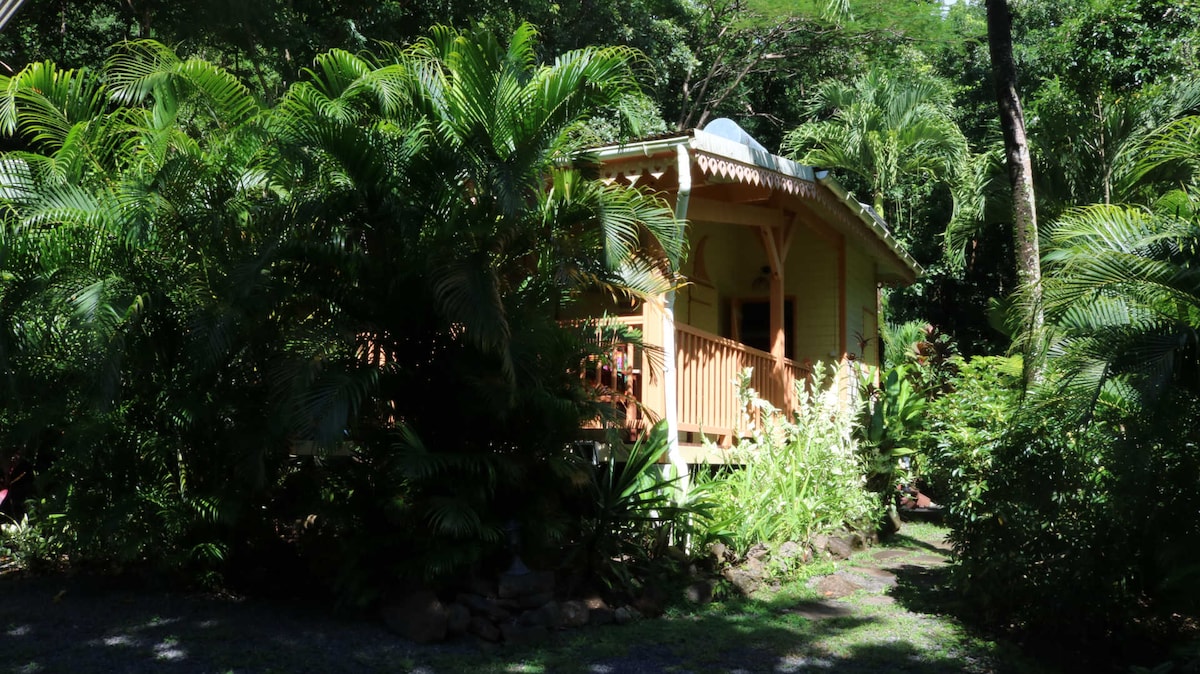 Ici vous serez chez vous. Bienvenue dans votre petit coin de paradis lové au coeur de la belle forêt tropicale de notre propriété. Avec sa terrasse sur pilotis, ce bungalow flambant neuf offre une vue exceptionelle su la baie de Grande Anse. Situé en contrebas de notre maison, un petit ensemble intimiste de 3 bungalows vous attend au calme, chaque bungalow est isolé dans sa petite bulle de verdure où vous pourrez profiter pleinement de votre jacuzzi privatif.