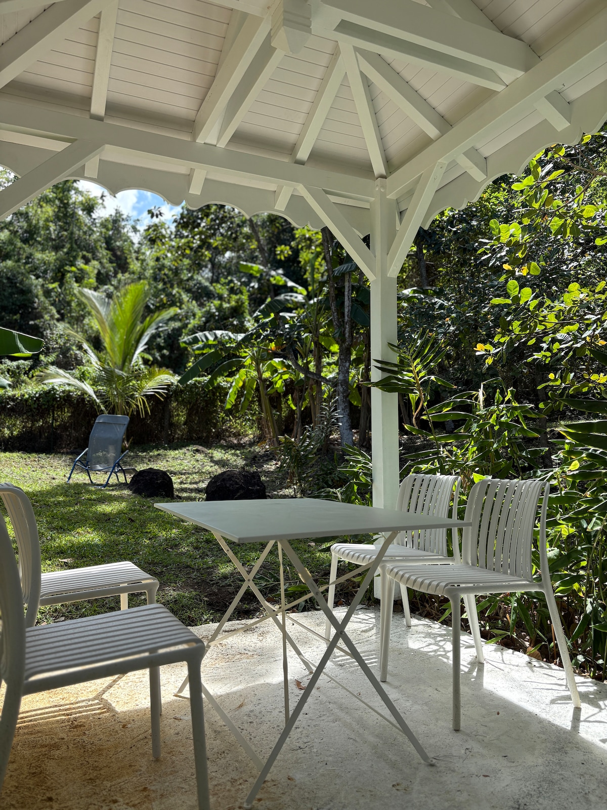 Studio cosy de 15m² en rez-de-jardin, niché entre mer et montagne dans un jardin tropical de 1400 m² avec bassin, piscine réservée exclusivement aux voyageurs du studio, salon extérieur et espace barbecue. Idéal pour se détendre après une journée de découverte. À 1h de l’aéroport, 20 min de l’embarcadère pour Les Saintes, 15 min de la Soufrière, à proximité des cascades, rivières, sentiers de randonnées et commodités. Un cadre parfait pour se ressourcer et profiter de la nature.