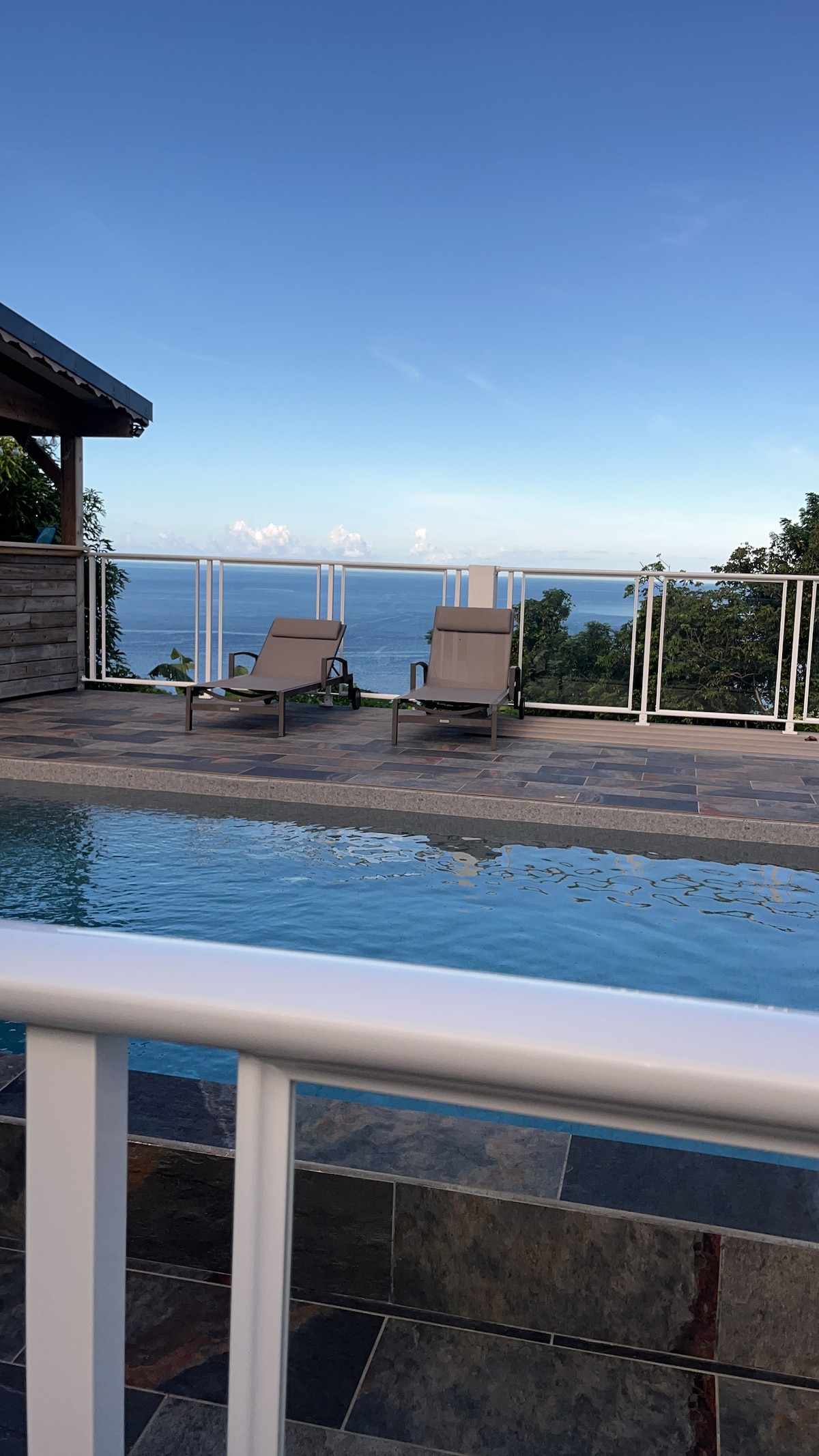 Charmant bungalow décoré avec goût situé entre mer et montagne, offrant une vue exceptionnelle sur les Saintes et Marie-Galante depuis une magnifique terrasse en bois avec jacuzzi. Vous pourrez apprécier la mer à perte de vue et profitez du confort de chacune des chambres ouvertes vers l'extérieur. Une localisation parfaite pour accéder aux chutes du carbet 10min, à la gare maritime pour les Saintes 7min, aux plages de sable noir 3min, à la Soufrière 25min.. Idéal pour les familles, amis...