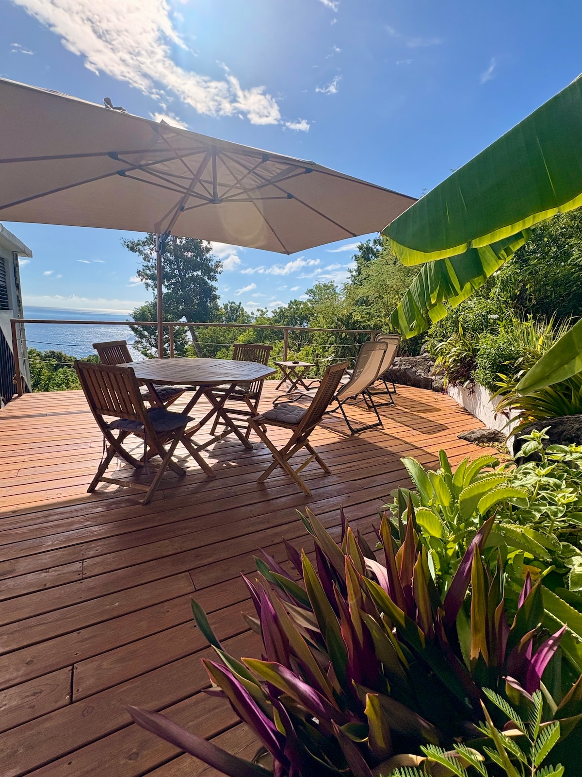 Découvrez Panorama Kréyòl, un bungalow sur pilotis offrant une vue spectaculaire sur la mer et les montagnes. Au cœur de la Basse-Terre, profitez d’un cadre en bois chaleureux, d’un jacuzzi privatif et d’une immersion totale dans la nature guadeloupéenne. Profitez de la proximité des plages idylliques, des randonnées vers la Soufrière, et des cascades. Climatisé et équipé d'une terrasse avec filet de catamaran, il offre confort et aventure. Un guide voyageur est inclus.