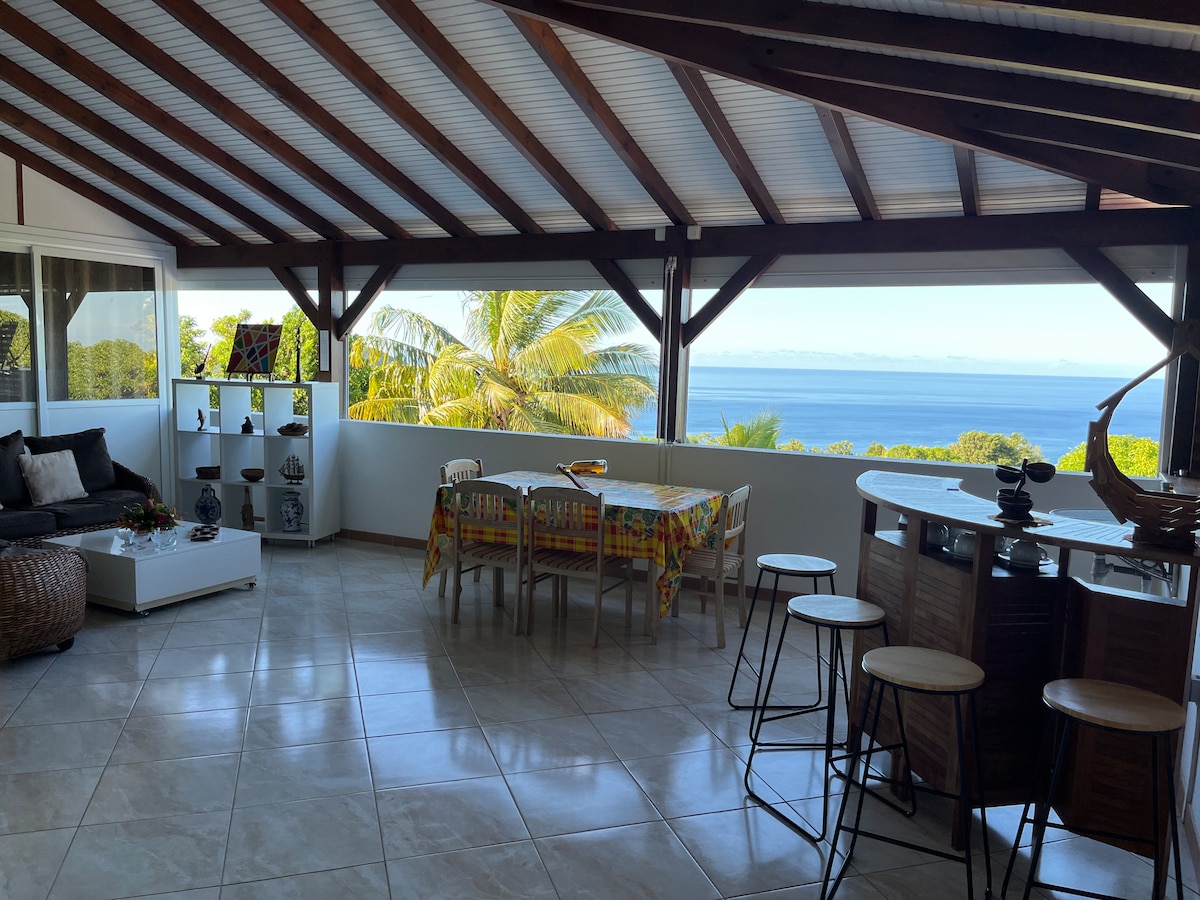 Maison , vue 180° sur mer des Caraïbes. Plage a 50 mètres. Cuisine toute équipée (plaque, micro-ondes, lave vaisselle, lave linge etc...), air conditionné dans les chambres, grande véranda de 50m2. Bar ouvert sur véranda. Deck avec solarium et barbecue. Chambres spacieuses avec rangements. 2 salles de bains, 2 WC. Salon et espace repas sur véranda. Wifi gratuit (fibre) Proximité route passante occasionnant en journée du bruit de voitures . Cet inconvénient disparaissant le soir et la nuit.