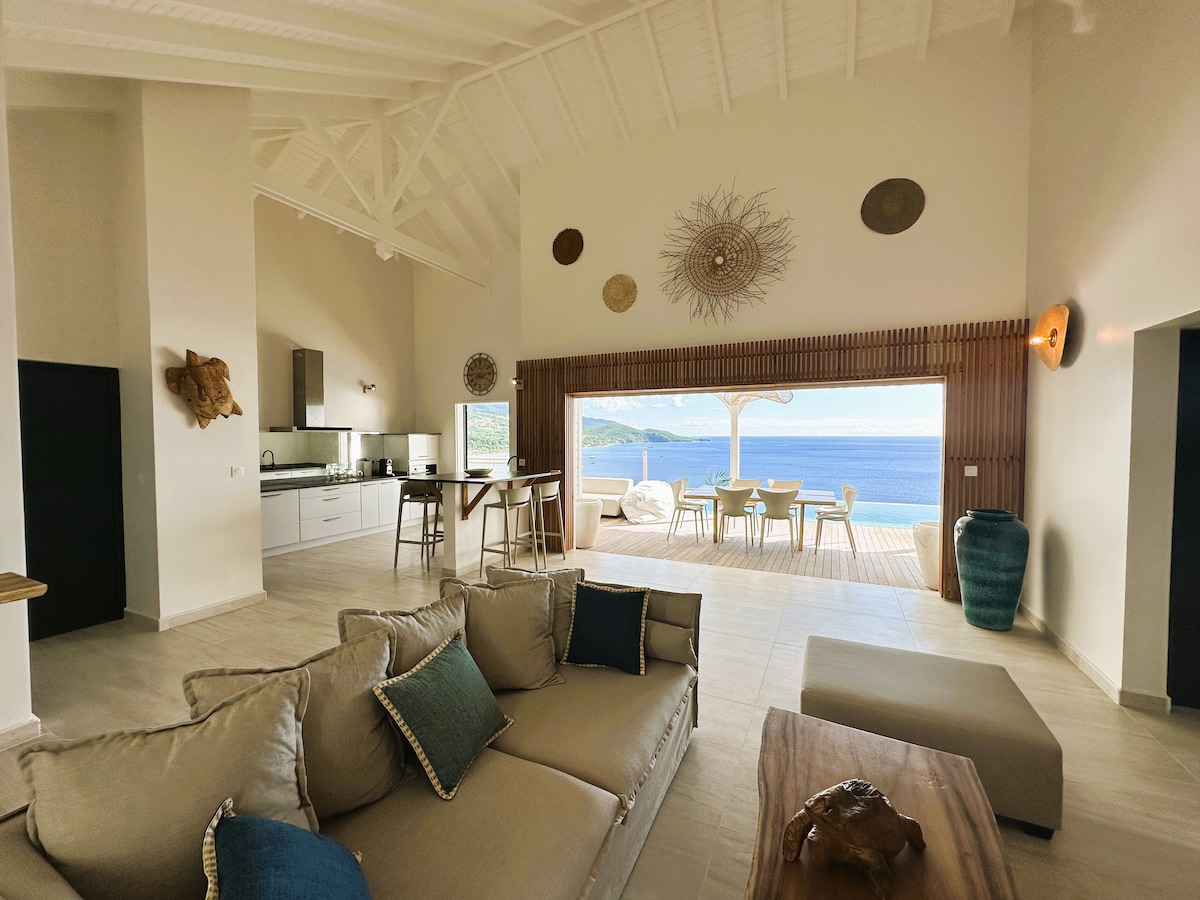 Venez profiter de la vue vue imprenable sur la mer des Caraïbes Vous pourrez vous rafraichir dans la piscine après vos activités de la journée: plongée, randonnées, plage... Un choix de restaurant vous attend dans le bourg ou sur les plages mais vous pourrez préparer vos repas dans la vaste cuisine équipée et diner à votre convenance dedans ou dehors Un repos paisible vous attend dans 3 chambres climatisées(2 avec vue mer)chacune équipée de leur salle de douche