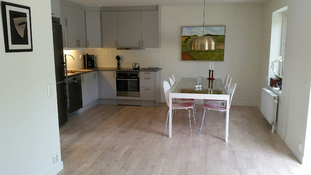Premium living in a 1 bedroom Scandinavian Design apartment. With the luxury of your own private terrace with sunshine from early morning to early evening. Barbecue included so you can both prepare and enjoy your meals outside. For relaxation you have a 2 minute walk to our heated pool and 10 minutes to the sea. Then whether you want to go to the food and entertainment centre in Båstad harbour or to the quiet beauty of Norrvikens Botanical Gardens, both are only a 15 minutes walk away.
