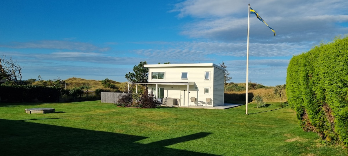 Vår mysiga stuga är byggd 2016. Den ger ett kompakt boende med de flesta funktioner du kan behöva. Egen uteplats med grill och utemöbler. Egen parkeringsplats och naturnära läge. Avfart från E6 vid Mellby Center. Där hittar du Ica Maxi, apotek, café, restaurang och McDonalds - allt på ett avstånd av 200 meter från stugan. Det är 10 minuters promenad till havet med den välkända , 12 km långa sandstranden. Det finns många sevärdheter i närområdet och diverse aktiviteter inom bekvämt bilavstånd.