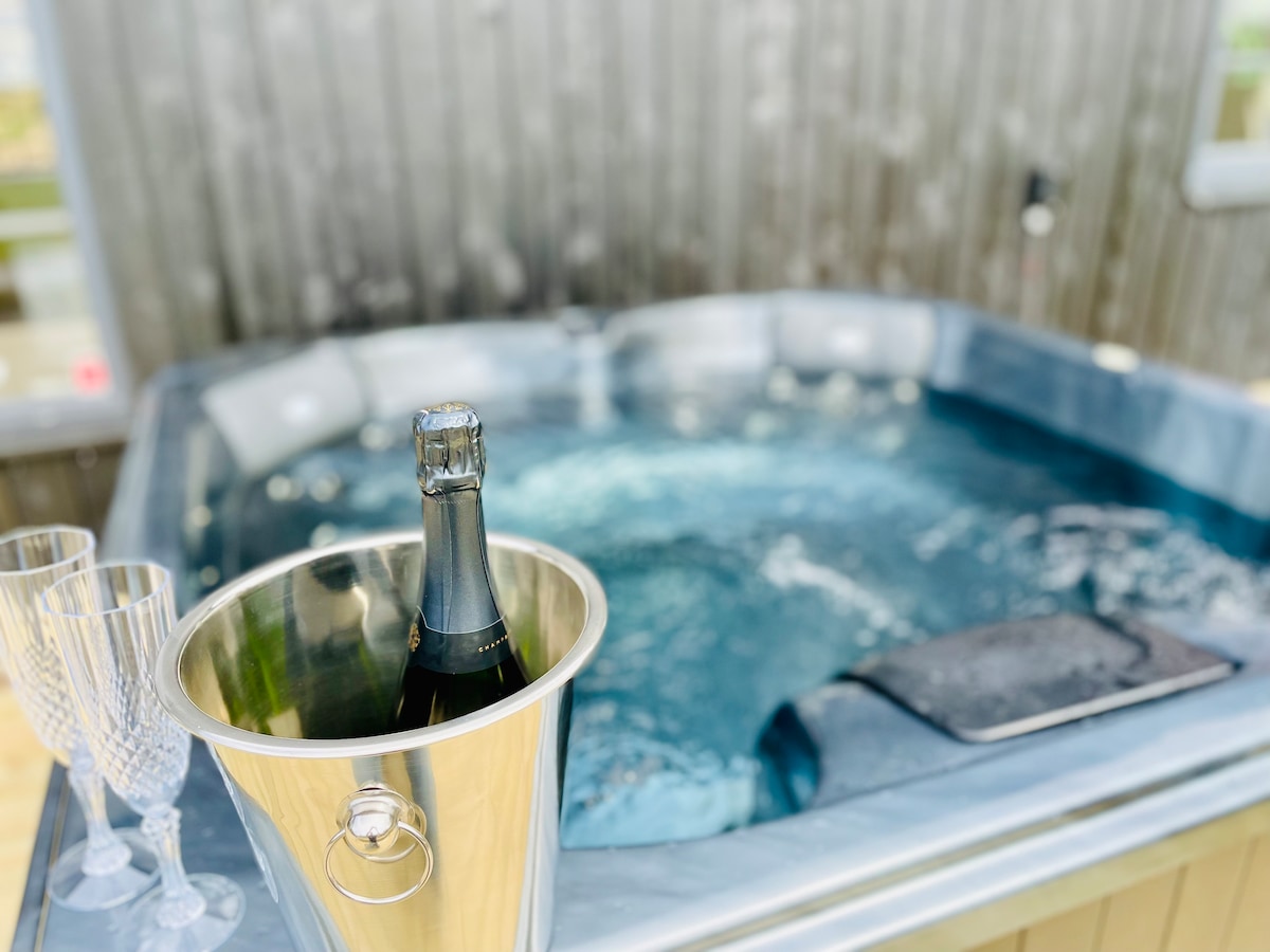 森林中的家庭度假屋,靠近水边,配有按摩浴缸