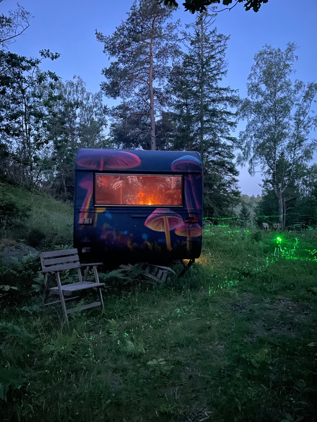 Hej ... jag bor på ett smultronställe och erbjuder en fantastisk plats mitt i skogen , 10 km till hav /badplatser,affär , restaurang Du kan vara i min trädgård och bara koppla av . Här finns varken Wi-Fi eller Tv . Om du behöver att koppla bort hela världen... så är denna avskilda platsen som gjort för dig . Husvagnen har 2 sängar Toalett Utedusch Gasolspis, micro, kylskåp med frys Golvvärme Markis Liten hund är tillåten Välkommen , Annette