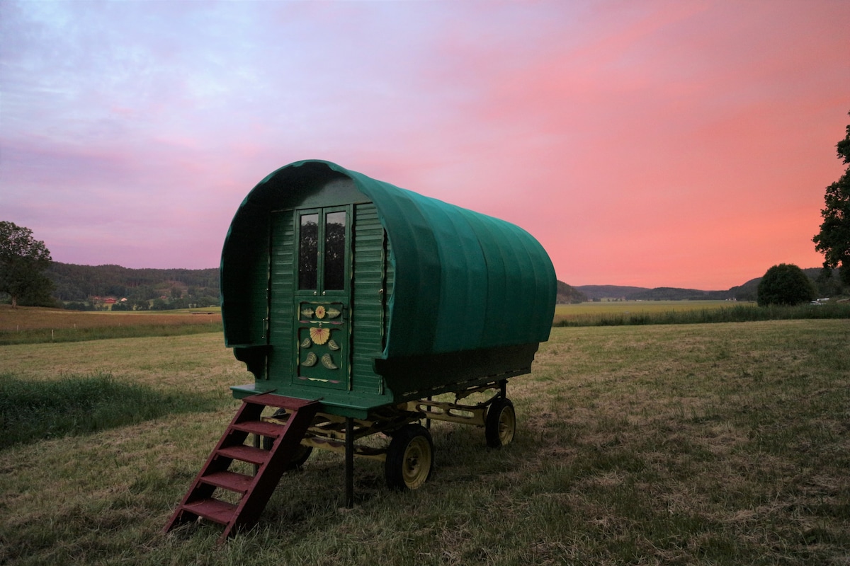 Traditional, offgrid, Scottish wagon. First built over 100 years ago and lovingly restored in the UK this little gem provides a unique and romantic getaway with a small, cozy 120cm double bed. It is situated in a peaceful meadow on a family run organic farm. It is a 5 min walk to a shared kitchen, shower, and compost WC. Outside of opening hours, you can enjoy your breakfast, dinner or reading a book in our unique Scottish café. Come meet our animals, family and see the nearby lakes and coast.
