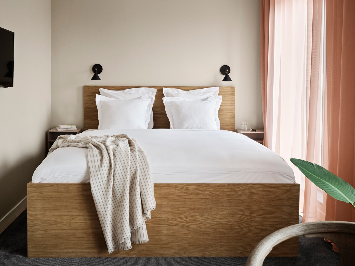 We are Aura, an apartment hotel in the center of Aarhus, located on Nørre Allé. Working closely with Danish architects and designers, we’ve shaped the building as a modern Nordic home, using warm wooden surfaces and earthy tones throughout. With easy self check-in and fully equipped apartments, we aim to keep travel practical and uncomplicated, with access to our hotel services throughout the stay.