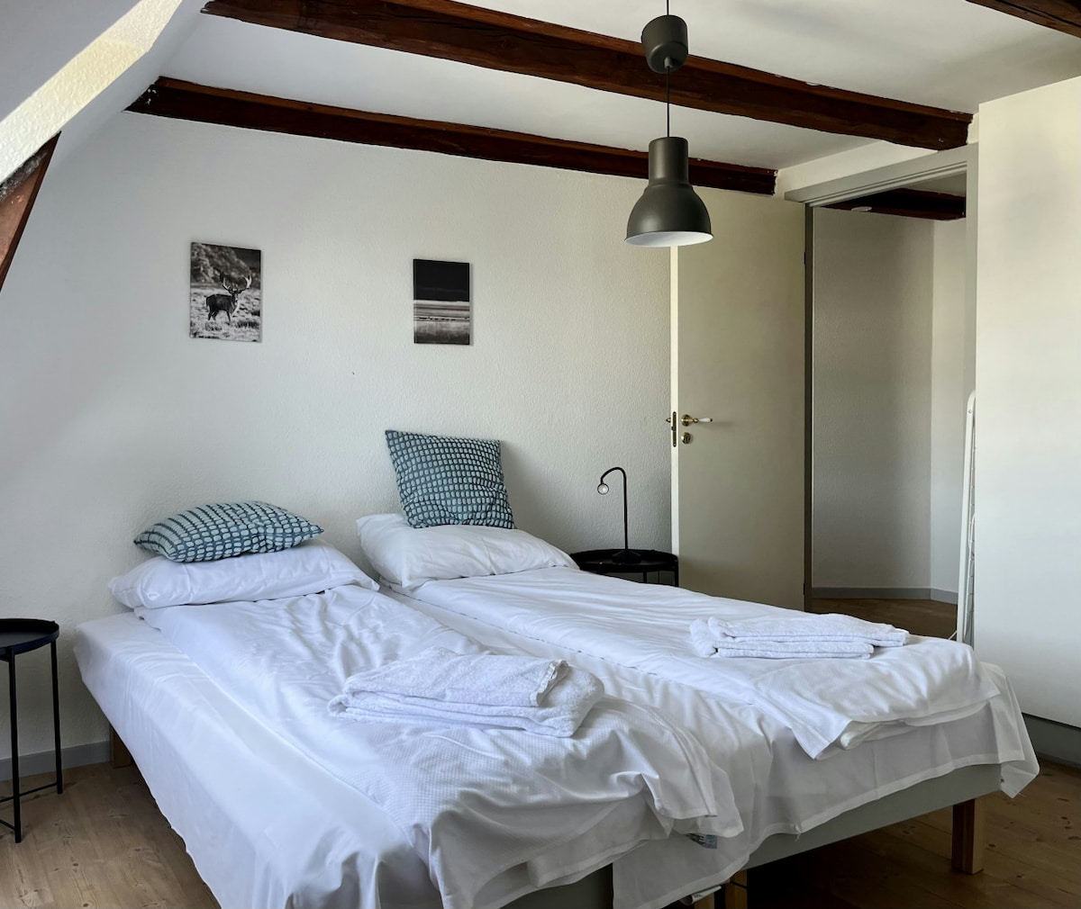 The guest suite is separated from the rest of the house. We live next door - just ring the bell if we can help you. The guest suite is exclusively being used for Airbnb. The large room has one large bed with room for 2 (3) people, kitchenette with basic spices and kitchen equipment, one cooktop, fridge, microwave oven, as well as a dining table and couch. The smaller room has two single beds. There's free wifi (300Mb) in both rooms. Also free Netflix There's a large bathroom with toilet, changing table, baby tub, shower, and underfloor heating. We supply bed linen and towels There are two private terraces. One facing west and one with a beautiful view facing east. Here you can enjoy your morning coffee or your evening dinner. You can cook yourself in the kitchenette or order pizzas from our local pizza bakery (300 meters away). There's only 400 meters to several grocery stores. 2 playgrounds within 200 meters