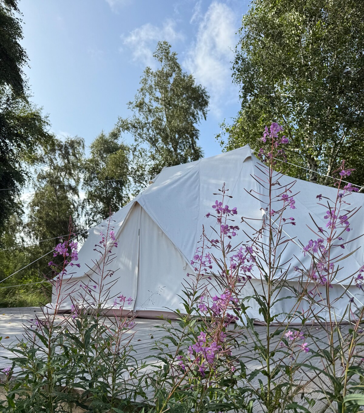 Romantic glamping in a large cotton tent, fully private with your own entrance and parking. Perfect for couples or a family with up to 2 children. Outdoor shower, real toilet, outdoor kitchen with BBQ and a view. Walking distance to the sea, with hiking trails from the tent. Self-service: bring your own bedding and clean after your stay. A unique nature experience – wake up to birds, shower among trees, and relax by the fire.