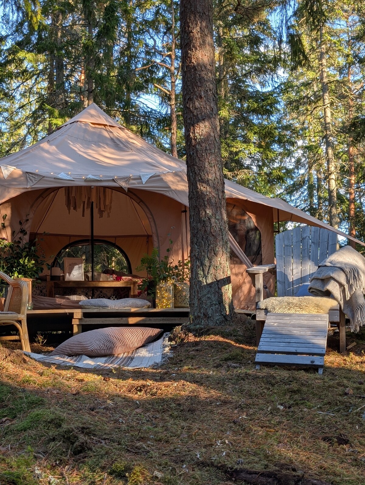 Glamping = a perfect combination of wilderness and comfort. Get a break from the city stress. Smell the flowers, listen to the birds singing, breathe fresh air and spend time together without any distractions. Stay close to nature, but enjoy the luxury of a warm bed and a fully decorated space to hang out in. We are located on the Swedish west coast, in the middle of the forest, but only a few minutes away from the beach. Bookable nights for 2026 are now available.