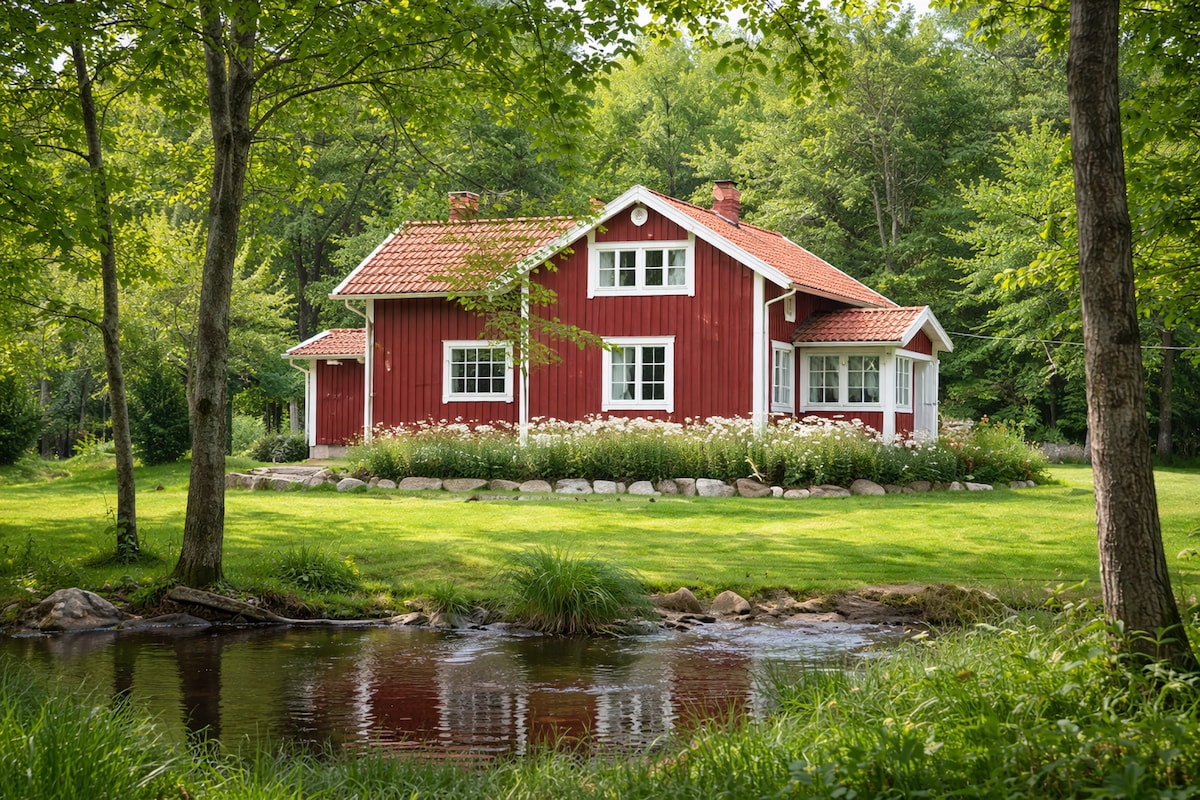 Escape to our picturesque red Swedish cottage, a peaceful retreat for 6, just 10 minutes from a golf course and 20 minutes from Skara Sommarland. Nestled by a private pond and stream, it's perfect for nature lovers. Features two cozy fireplaces, tub, dedicated workspace, and EV charger. Located just 20 minutes from the famous Hornborgasjön crane migration, this serene countryside home offers a unique and relaxing getaway. Enjoy the tranquility of nature with modern comforts.