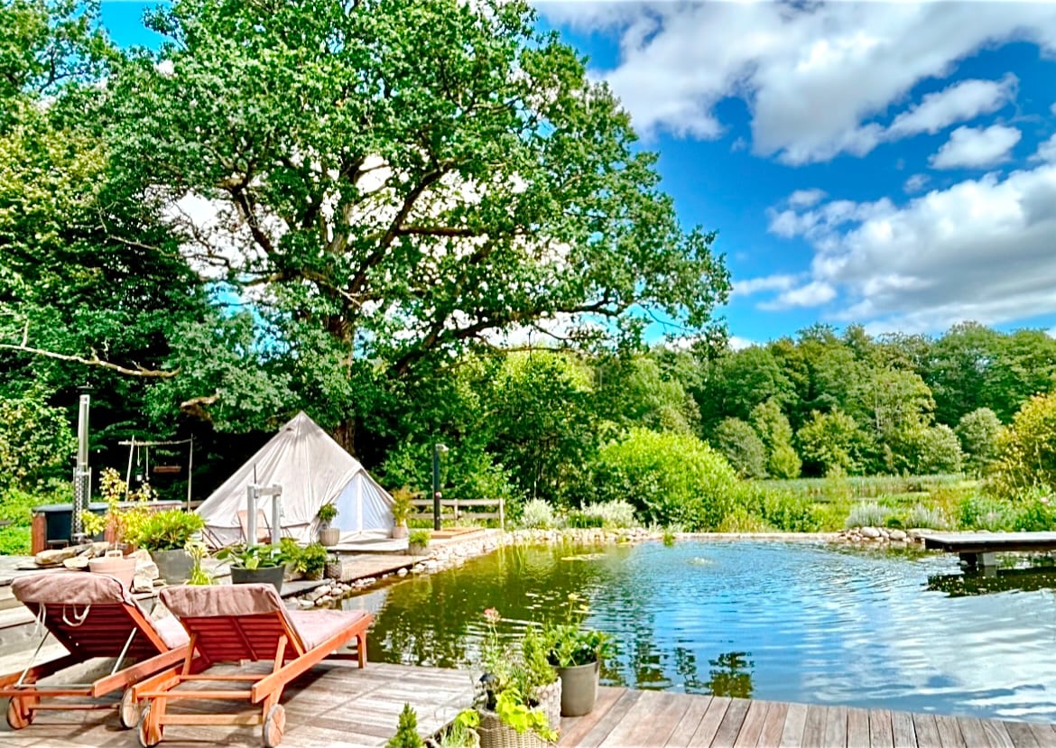 🌿 Cozy Log Cabin with Natural Pool & Glamping near Gothenburg. Perfect for families, friends, & romantic couples who love nature, comfort and a touch of luxury. • Fully equipped kitchen • Wood-fired Hot Tub • Pets welcome • Glampingtent 25 m2 • Big garden • Patio with roof • AC+ Floorheating • WIFI • Gas BBQ grill • NETFLIX/HBO • Shower/Bathtub • Washer/Dryer • Bed linen/Towels • Memory Foam Madrasses • 2 bikes summertime • 2 Sun beds • Fireplace • Outdoor sunheated shower