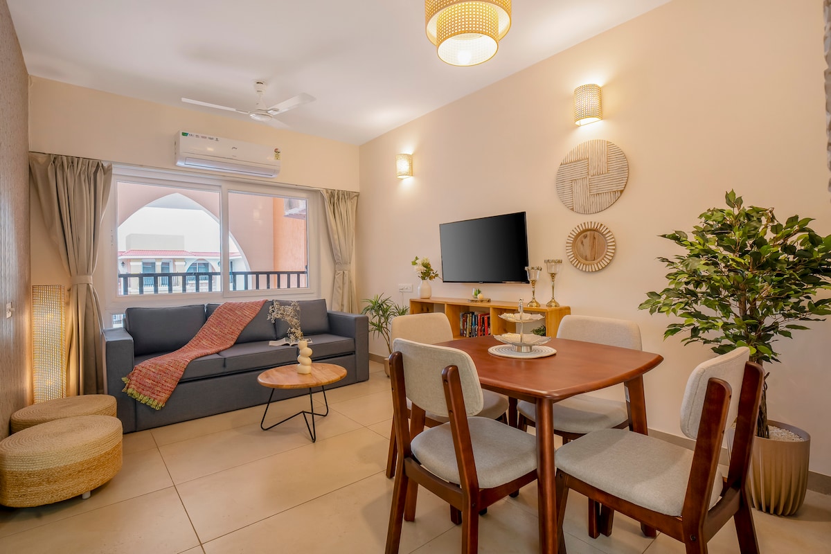 Welcome to Bohobnb, where comfort meets bohemian charm! Nestled in heart of Siolim, our 1-bedroom duplex apartment offers a unique stay with an attic and a private terrace. Surrounded by lush greenery, this home provides beautiful views that ensure peace and tranquility in a gated community with all the modern amenities including elevator, swimming pool, High-speed WiFi. Whether you're relaxing in the attic or soaking up the sun on the private terrace, every moment promises peace and comfort.