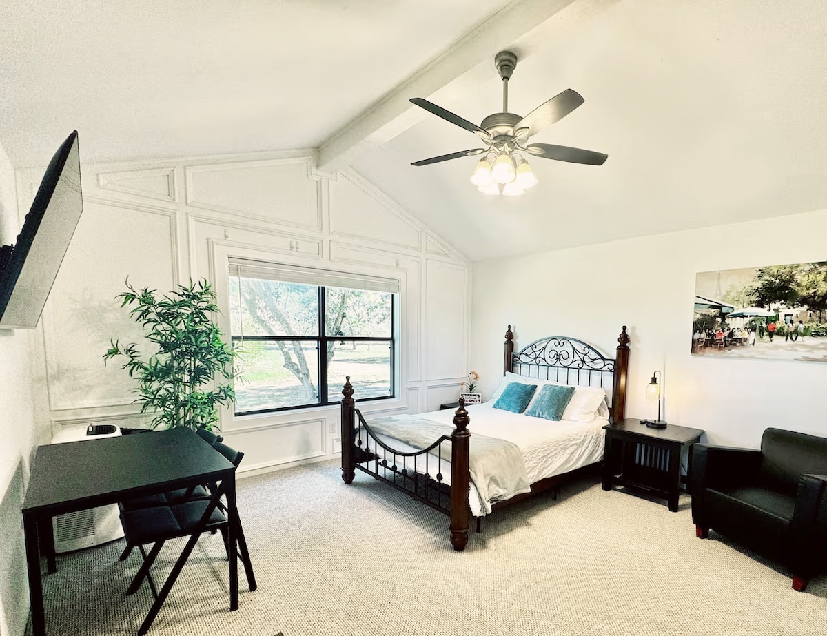Quiet studio apartment with private north-side entrance on 4 peaceful acres in Lockhart—ideal for travel nurses, business travelers, and longer stays when you want more comfort than a hotel. Separate apartment with kitchenette: sink, mini fridge, microwave, single burner, toaster, and cookware. 6 min to Walmart, 20 to San Marcos or Bastrop, 25 to Tesla, 35 to Austin, 60 to San Antonio. Walk the meadows and enjoy the country. Shared laundry with another tenant -Low noise is appreciated.