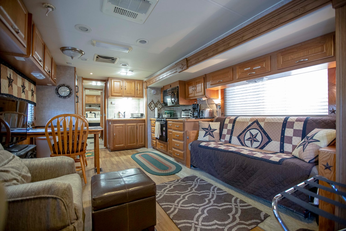 Escape your everyday routines and visit Autumn Acres for a stay in this spacious 38’ Texas themed Motorhome with 2 slide outs. Perfect for a couples getaway. Offers all the necessities: Queen bed, wardrobe closet, full bathroom with private toilet room, full kitchen with condiments and coffee provided. 3 Televisions with Roku streaming and wifi access. Two A/C units to keep you cool in the summer months and an Electric Fireplace to warm up and create a romantic experience for our Texas Winters.