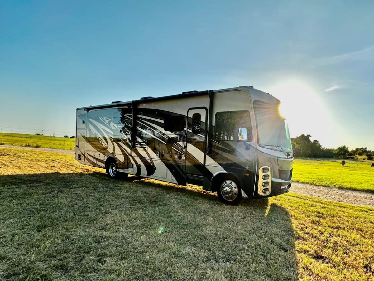 Meet Howdy, our brand-new 39' Forest River Georgetown 5 Series (36B5), perfect for up to 10. Gas-powered 7.3L V8 engine, automatic transmission, 3 camera monitors, auto-leveling, making driving & parking a breeze. Inside, enjoy 3 slide-outs, an 82" ceiling, a spacious kitchen with an 18-cubic-foot fridge, & 2 full bathrooms. The master BR features 2 slides, & entertainment includes 5 TVs, a sound bar, & a full outdoor system. Powered by 50 AMP, solar panels, & a generator. Let’s hit the road!