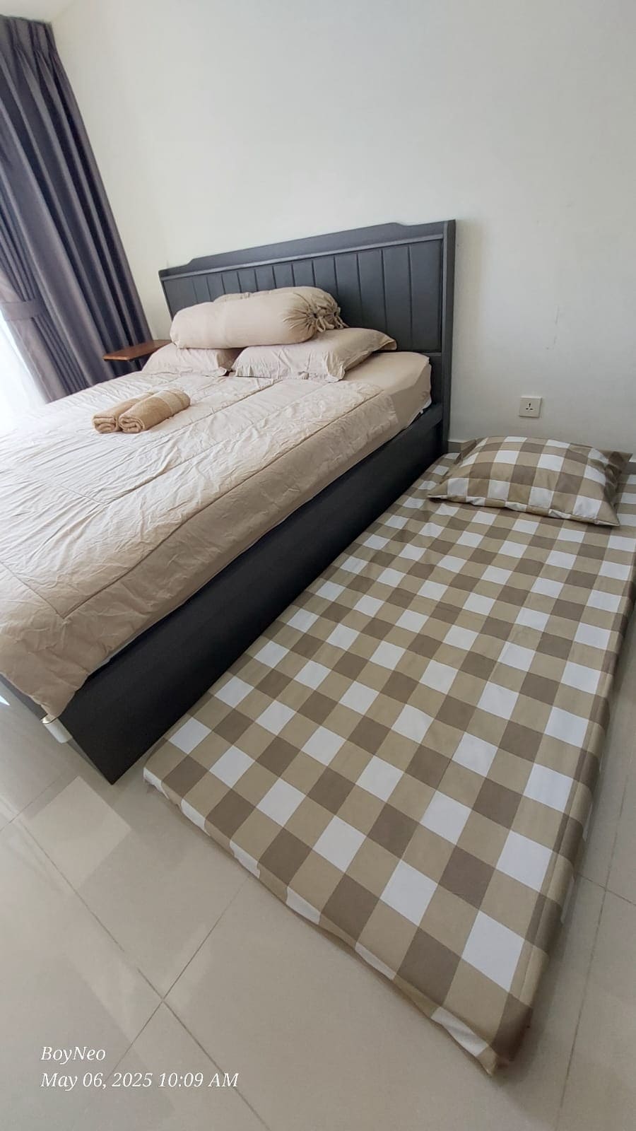 The location is central Batam city, near Nagoya hill mall,grand batam mall, BCS mall, Penuin market and central culinary 15 minutes from Harbour bay ferry terminal. You can find foodcourts, super market, cafe, massage near by the apartment. Free parking, there are multi-storey carpark and outdoor carpark The bed is king size and 1 sofabed