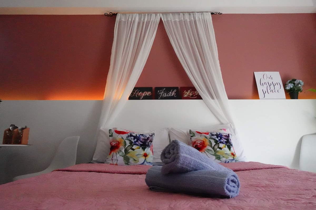 We want to share the tranquility of our space to other like minded people looking for a break from the fast paced city life. Our home is a 1 bedroom 50sqm unit with an expansive balcony - more spacious than others in the same price range. It's ideal for a couple or a family of 2 adults and 1 child. Use of swimming pool - see details provided in the listing description. Parking NOT included but can be provided for P250/night. Late check-in fee after 4PM. Simplicity. Peace. Uncomplicated.