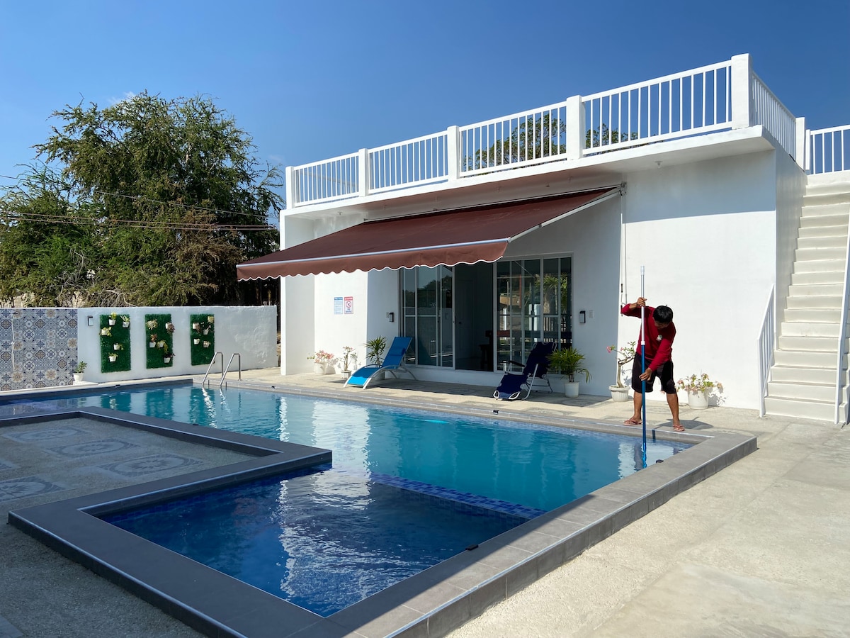One of the very places in Mabini where the beach and pool are few steps away from your room . No difficult and steep pathways which is common in other offerings in Mabini. The place has a balcony overlooking the pristine waters of Anilao. Enjoy the landscaped Garden by the beach while you and your company relax or have their dinner. Behind your room is the pool which is nestled in between the guesthouse. Each room has 2 queen beds and a separate dining area. Semi functional kitchen