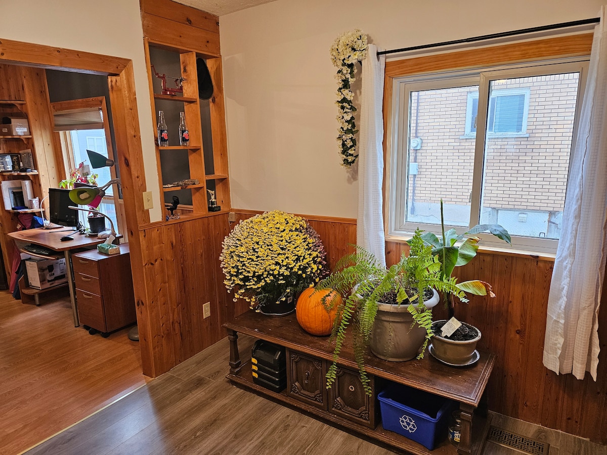 🇨🇦 Enjoy this centrally located clean boho apartment with private entrance. This is a one queen bed apartment with open floor plan. Fully equipped kitchen, full bathroom, breakfast bar, desk and dining area. You'll have everything you need for your short or long-term stay. This is located in the basement of a house. Host lives upstairs with with her dog. The apartment is completely private. Backyard access is shared.
