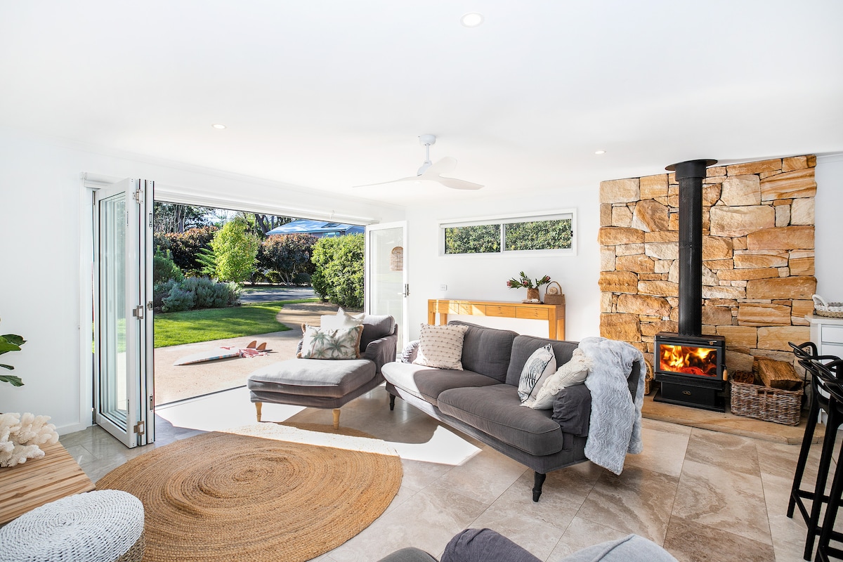 Our modern open plan home is just 2 minutes walk from Denhams Beach and just a 5 minute walk to Surf Beach that is patrolled in summer. You will also be within walking distance to local shops and beachside café. This luxury property has all you need for a relaxing holiday where you can unwind and be refreshed. Basic pantry supplies included as is all linen and beach towels. This is dog friendly home to WELL behaved pooches and has a wonderful outdoor entertaining area as well as a fire pit.