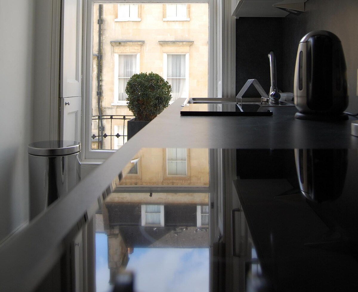 Spencers Apartment is fantastically situated just 10 mins walk down into the heart of the city. The fresh, interior design of Spencers Apartment subtly captures the essence of the historical Georgian splendour that Bath is so famous for, yet has been beautifully brought up to date with contemporary styling and highest quality finishing throughout. Large bay windows enjoy a lovely view over the city.