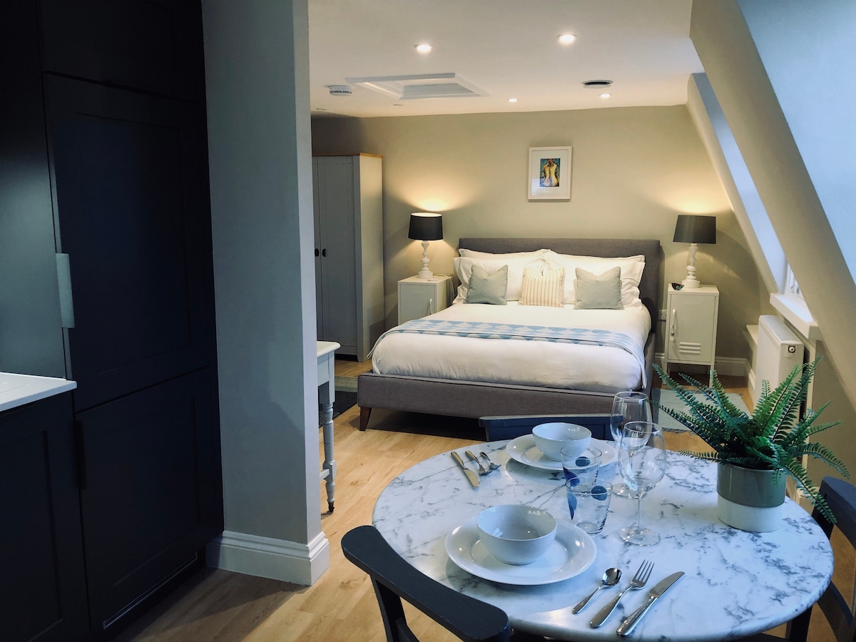 A cosy, warm and romantic room for couples, solo adventurers and business travellers. PLEASE NOTE narrow steps lead down to the private front door, these may not be suitable for people with mobility issues to access. There is a wood burning stove installed. The Bathroom is contemporary in style with an electric shower, sink and toilet. There is a small separate area to make tea and coffee with a fridge, toaster and microwave. If not available check our other apartment.