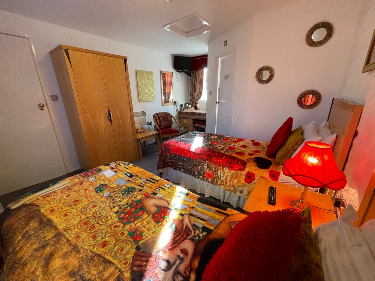 A hip, romantic Glastonbury Festival themed Hotel room, Uniquely designed in a retro style with artworks and memorabilia. Right next door to the Glastonbury Festival Site we offer a special opportunity to come and see what village life is really like here in Pilton. Situated above the busy Village Pub, that boasts a beautiful beer garden, Incredible events space (where we have monthly comedy nights and regular music events , keep your eyes peeled), Amazing Food and a Warm Welcome!!!