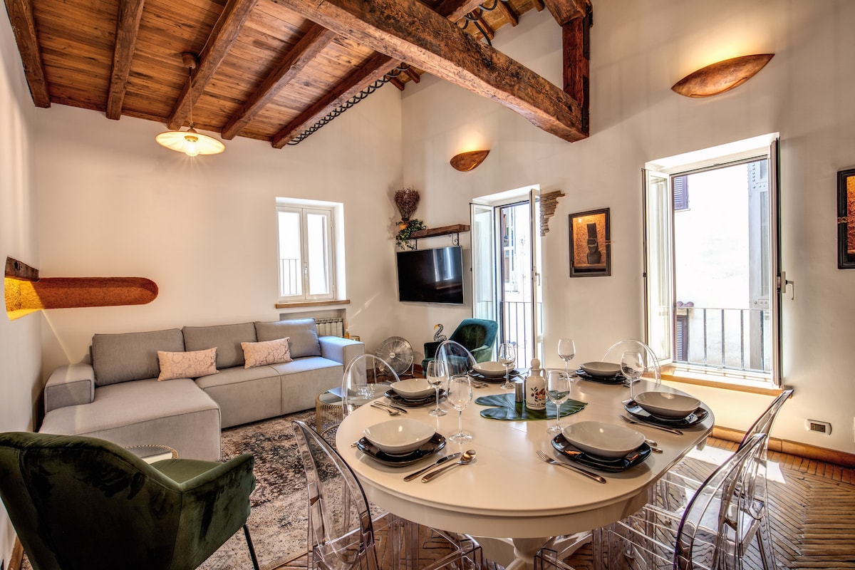 Light the large stone fire and relax with a book in this elegant home overlooking Via dei Banchi Nuovi. Coffered ceilings cap cozy rooms in relaxing, neutral tones accented by designer furnishings and owner's original paintings. This charming fully renovated house is located in one of the most beautiful, ancient and vibrant area of the center of the Eternal City. We also like to offer eco-sustainable hospitality: we use electricity from renewable sources, organic products.