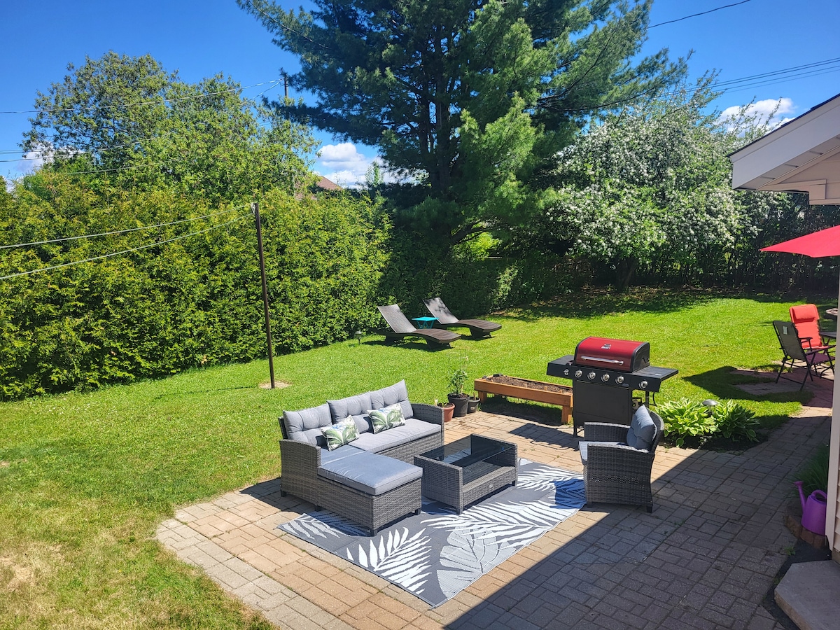 Centrally located in downtown Bathurst, minutes walk to Sobeys, Liquor store, Multiple restaurants and bars. This spacious apartment provides a separate entrance, it also includes a kitchenette, washer/dryer, cooking appliances such as: air fryer, toaster, Keurig, microwave, electric frying pan and mini fridge. This lovely place also offers a one bedroom with a queen bed and a pull-out bed in the living area (linens are in the L couch module). We also provide a TV, fireplace,and Netflix. :)