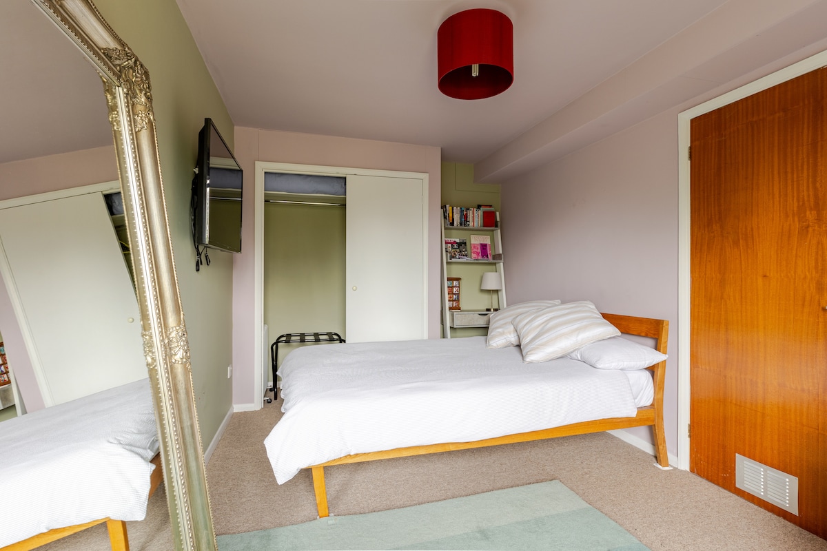 A clean, compact space with comfortable double bed, private entrance and en-suite facilities. Located on the edge of the city overlooking beautiful countryside but just 20 minutes from the centre via nearby bus stop. Free street parking outside or close by. No kitchen but microwave, toaster, kettle, fridge & crockery provide for simple catering. There’s also WiFi and a smart TV. The Den adjoins the main house via a locked door. Relax in the lovely garden when the weather allows.