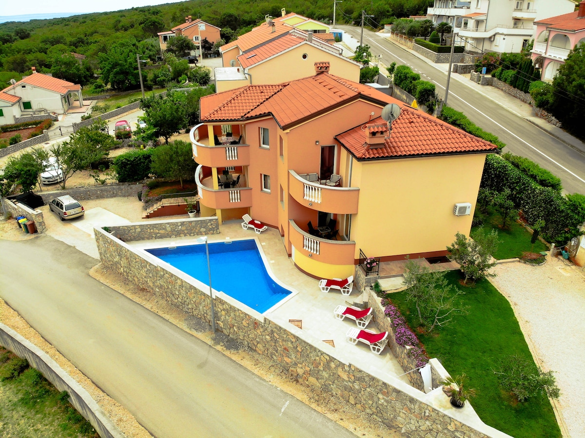 Visit us in the most beautiful spot in Croatia - on the island of Krk in BASKA! Our exclusive holiday complex has 9 spacious self-catering apartments with a balcony or terrace and garden, a private pool area with sunbeds and parking spaces for our guests right next to the accommodation. Due to their size and equipment, the apartments offer all possibilities for a holiday for two, with the family or with friends.
