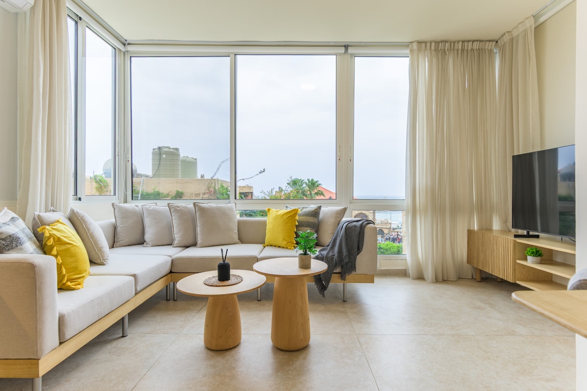 Start your day with a stunning sea view from the terrace and end it with a breathtaking sunset on the shore, while enjoying the bohemian decoration and Zen mood. This apartment is perfect for couples, families, and for a small group of friends. Location is guaranteed to be the best. You can access the beach and cultural sites in <1min walking, and the best restaurants, lounges, and clubs in Batroun in <5min walking.