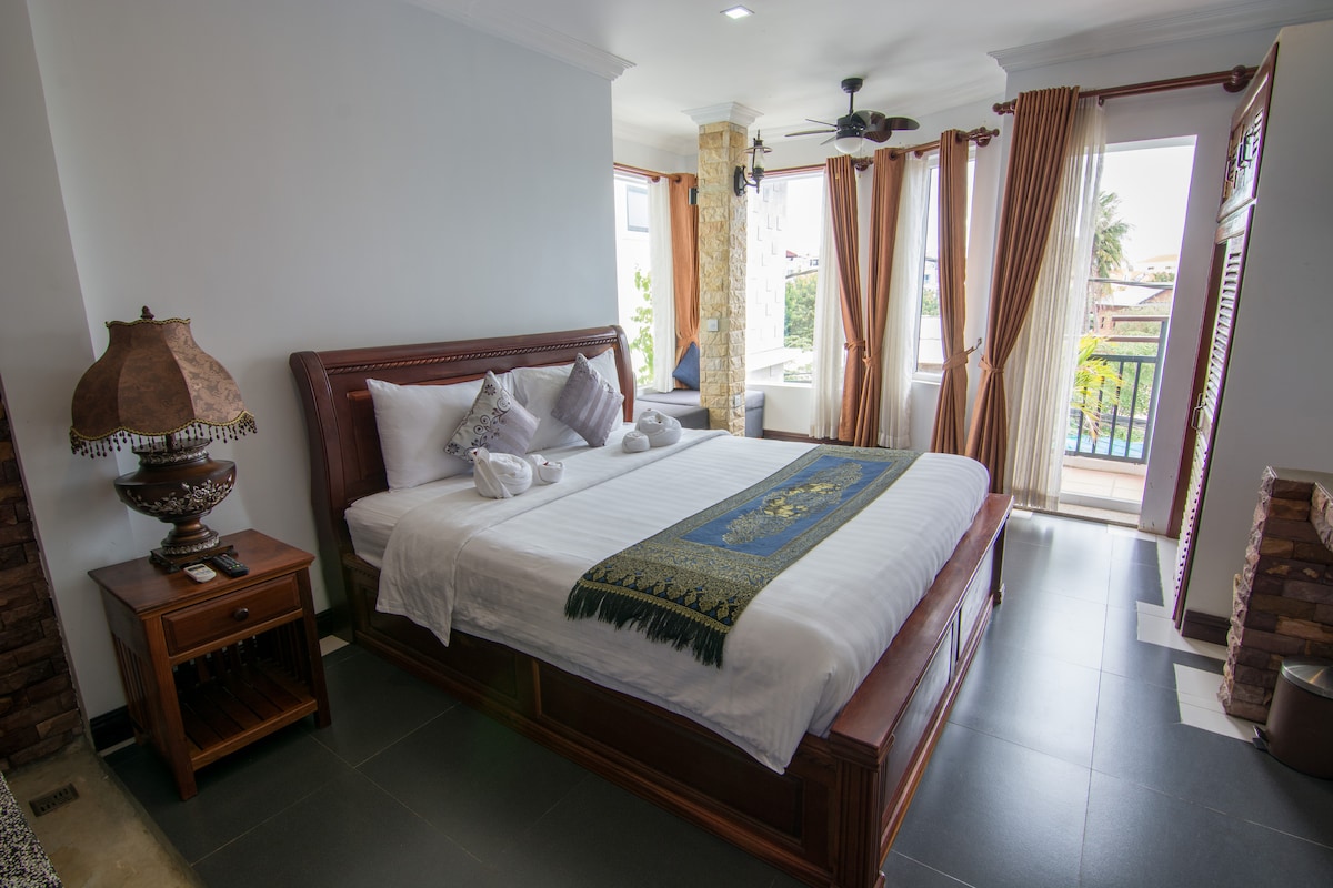 Natural Relax Villa! This room has 1 King bed Deluxe Pool View with balcony view to swimming pool and surrounding green garden, air-con room, hot water, free using internet as wifi and swimming pool, housekeeping, Included daily Breakfast(from 06:00am-10:00am). Available Tour desk, transportation by Tuk-Tuk or Car or Minivan, bike rental, Tour guide. IF FULLYBOOKED,CHECK MY OTHER LISTING FOR THE SAME ROOM!