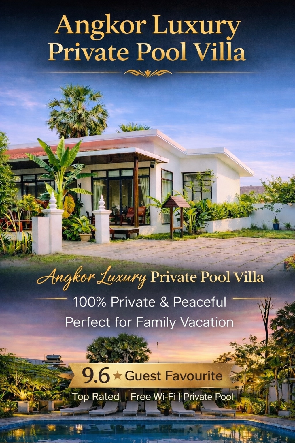 A spacious boutique home of 5 bedrooms with a private pool, built in a unique style of Khmer and Western architecture with an oasis ambiance, located near the largest local market of Siem Reap, only 10 minutes from downtown Pub Street, and 15 minutes to the marvelous Angkor Wat. This beautiful villa is ideal for a group or a family to enjoy a private stay and feel as if you are at home. Authentic Khmer meals, transport/guided tours, and airport transfers could be arranged during the stay.
