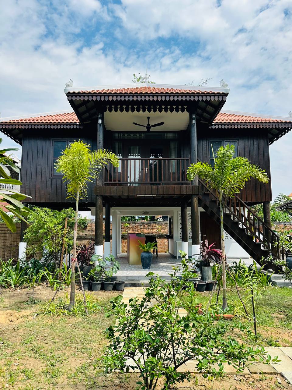 Roya Khmer House is a magnificent traditional Khmer House. We keep all external formats remain the same in the past 100years as the Khmer wooden house. My husband and I have seen the potential and valuable of old wood, so we decided to buy old wooden house from the countryside abandoned and no longer needed from the owner. Some of wood it was completely damaged but some of wood is still use and decor for the beautiful house. The house is surrounding by garden view.