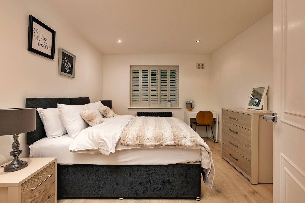 Sip an evening glass of wine among verdant foliage in the garden terrace of this Italian-styled luxury apartment. Sit back and relax on a large and comfortable cream corner sofa. One of the finest bedrooms you will ever experience. As well as the luxurious 6ft 7” bed, it has a beautiful ordained fireplace, a rocking chair and even a bathtub tucked away in the corner of the room.