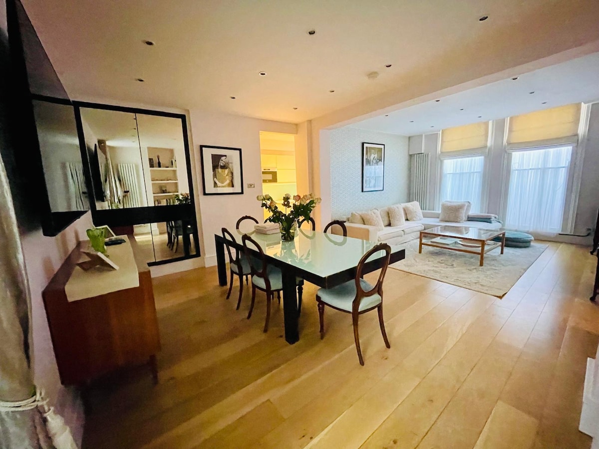 A stylish &spacious 3 Bedroom, 3 bathroom flat with huge lounge with fast wi fi, & own private entrance in an exclusive part of Chelsea . A 100 inch TV if you like watching movies! 1 minute from Chelsea embankment, close to-river walks and green spaces of Battersea Park. Walk 2 minutes in the opposite direction & you are on the famous King's road extensive range of shops, bars, restaurants, galleries and music venue Cadagon hall. Sloane square tube station & Imperial Wharf are closeby.